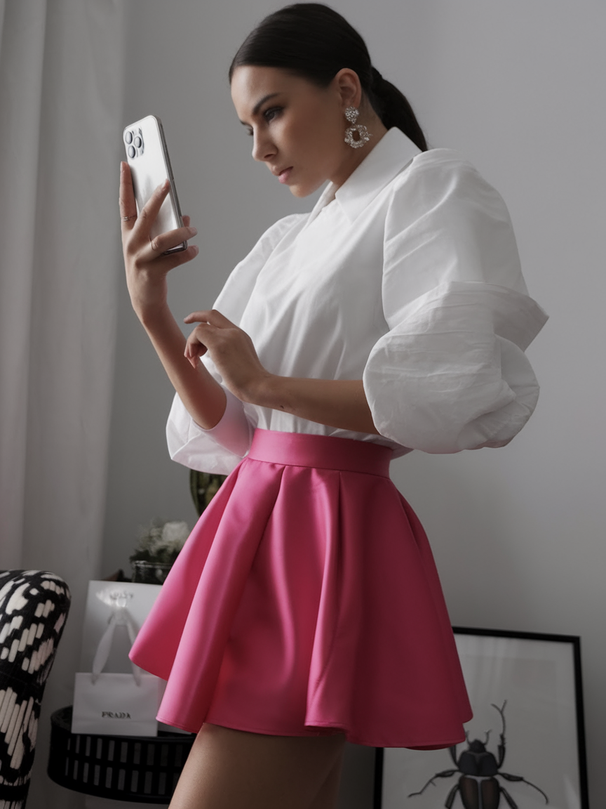 A bright pink flared mini skirt takes center stage, styled with a white puff-sleeved button-up shirt for a dramatic yet chic look. The voluminous top contrasts beautifully with the structured skirt, creating an elegant silhouette. This bold pairing is ideal for spring parties or stylish day events.