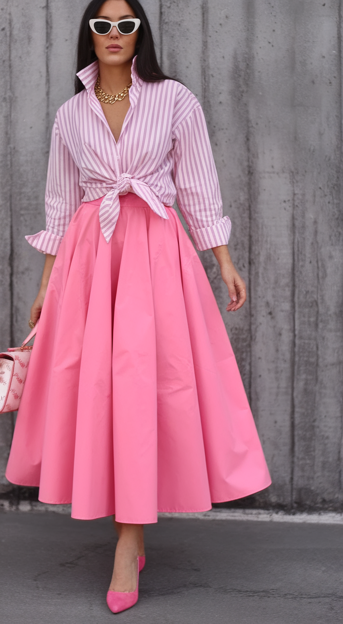 This ensemble combines a pink full-circle maxi skirt with a knotted pink-and-white striped button-up shirt for a playful and feminine vibe. The outfit is accessorized with matching pink pumps and a quilted pink handbag, adding to its coordinated charm. A stylish choice for spring outings or brunches.