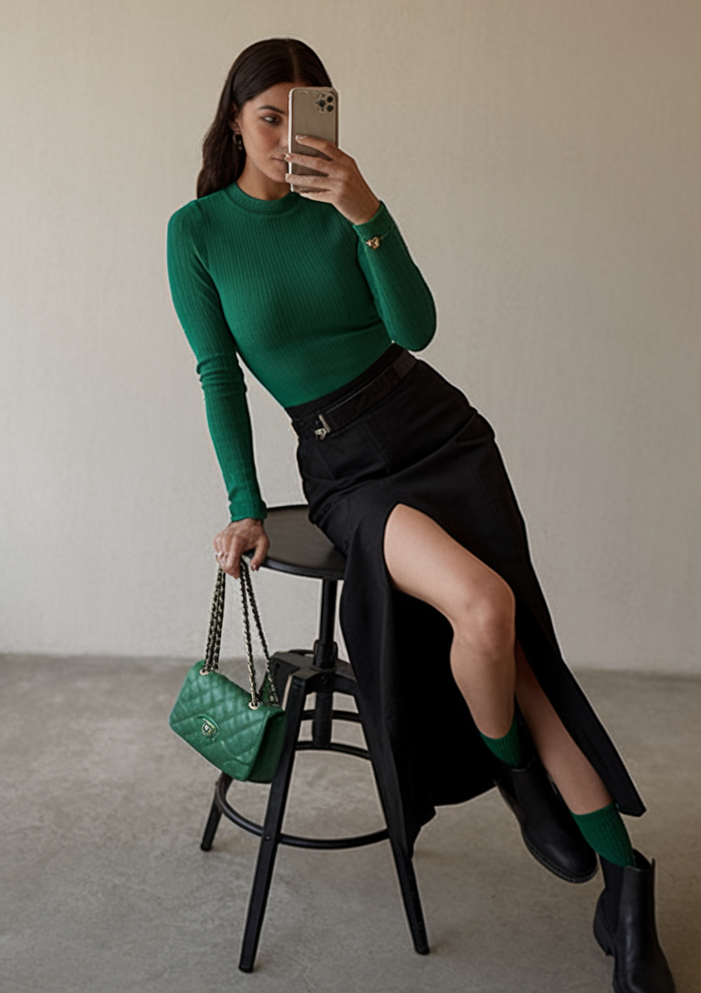A black maxi skirt with a high slit is paired with a fitted green knit top for a sleek and modern outfit. Coordinating green accessories, including a quilted handbag and socks, add a pop of color. Black ankle boots ground the look, making it versatile for various spring occasions.