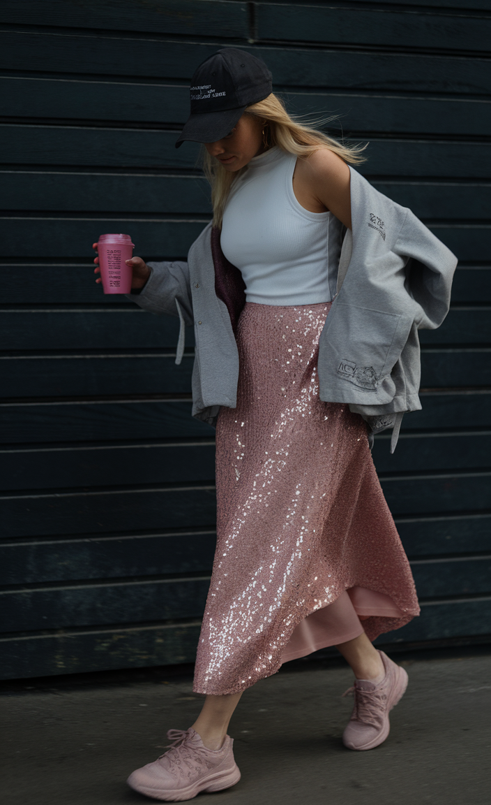 This look combines a pink sequined midi skirt with a white ribbed tank top for a mix of glamour and casual style. A gray hoodie and pink sneakers bring a laid-back, sporty vibe to the sparkling skirt. This outfit is ideal for women who love a unique and playful spring aesthetic.
