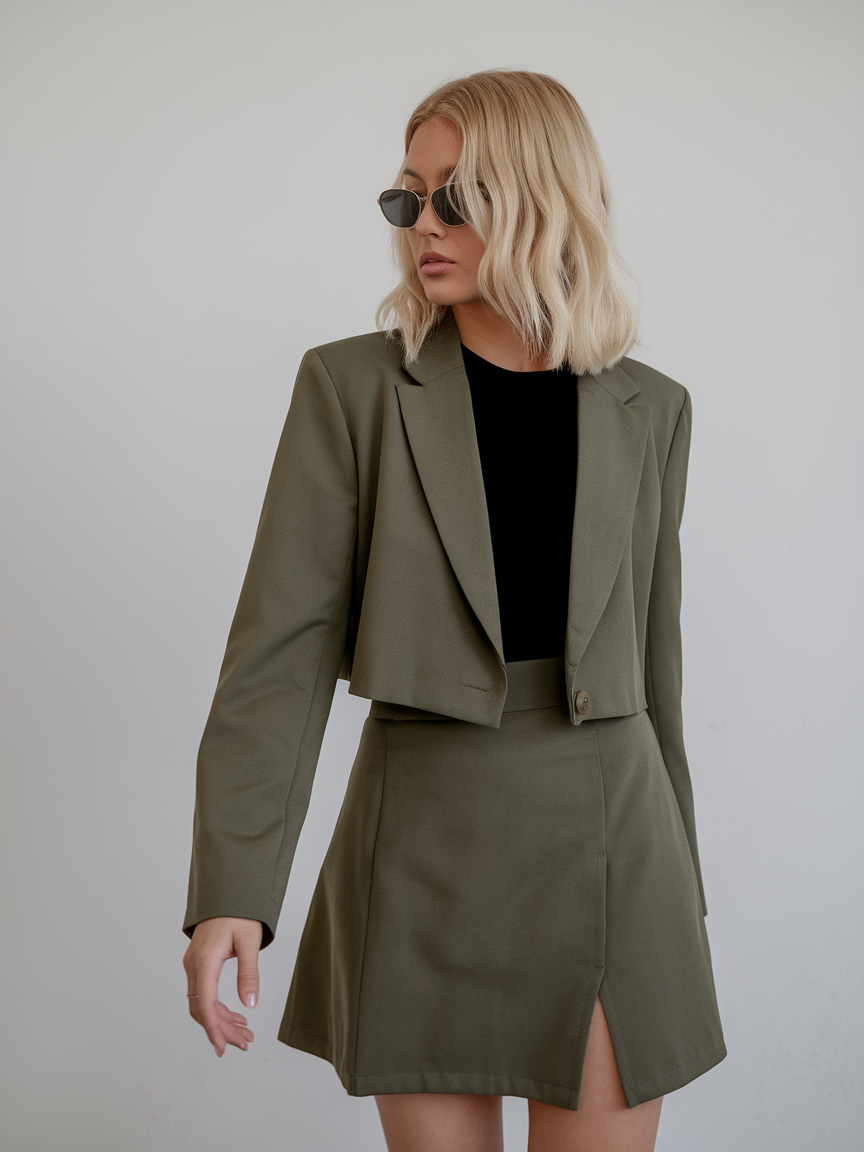 This outfit features a cropped olive blazer paired with a matching mini skirt with a subtle front slit. The clean lines of the suit are elevated by a black fitted top, creating a sharp and modern look. Perfect for a classy yet minimal spring wardrobe.