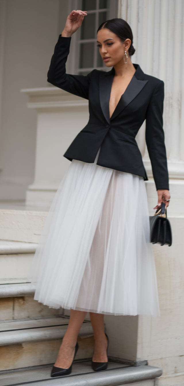 This look features a tailored black blazer styled over a white layered tulle midi skirt for a refined yet feminine vibe. The structured top contrasts beautifully with the soft, flowing skirt. Black pointed heels and a mini handbag complete this elegant spring outfit.