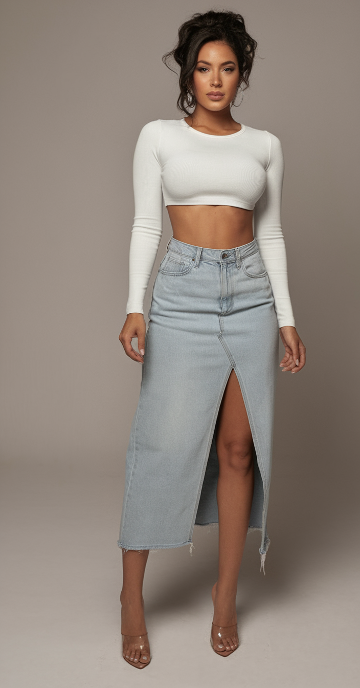 A light blue denim maxi skirt with a front slit pairs perfectly with a long-sleeve fitted white crop top for a sleek and casual look. The clean lines of the skirt and top create a balanced silhouette. Transparent heels add a modern finishing touch.
