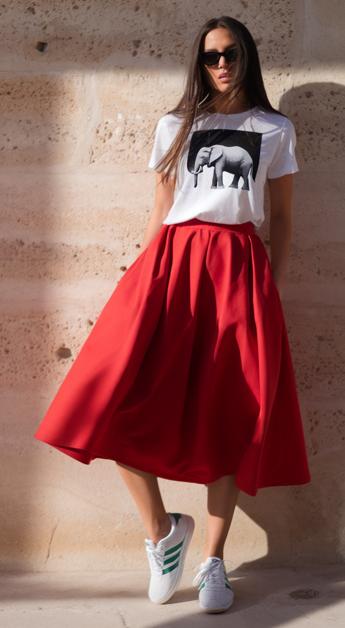 A pleated red midi skirt is paired with a white graphic T-shirt for a laid-back style. White sneakers complete the outfit, keeping it casual and comfortable. This look is perfect for a casual day or running errands in spring.