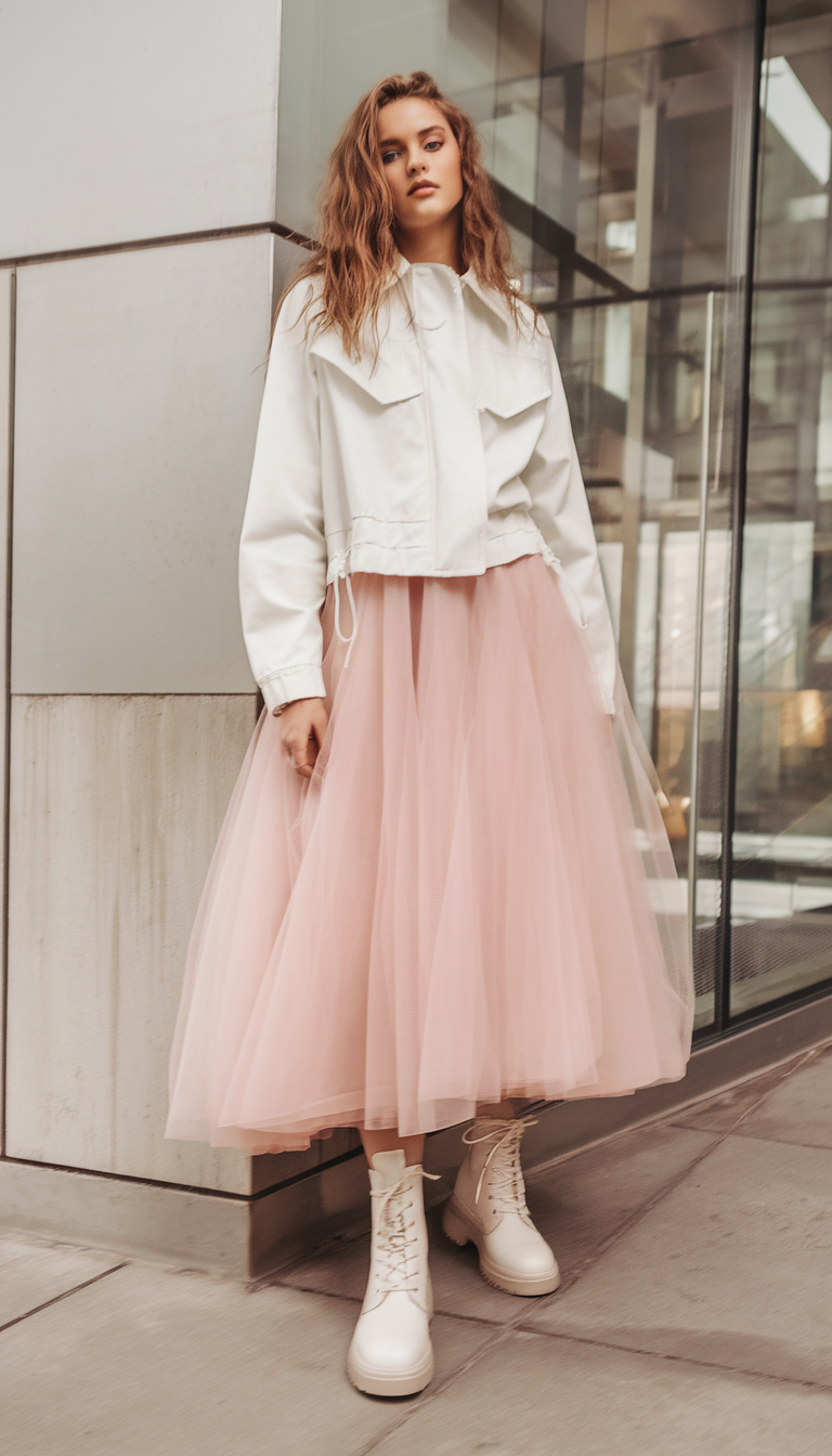 This outfit features a pink tulle maxi skirt paired with a white cropped jacket for a playful yet edgy vibe. The pairing is completed with chunky white lace-up boots, adding a modern contrast to the feminine skirt. This look is perfect for a bold and creative spring statement.
