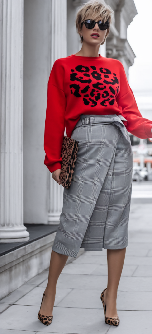 A grey plaid wrap midi skirt is styled with a vibrant red sweater featuring a bold leopard print. Leopard-print accessories, including shoes and a clutch, tie the look together with striking coordination. This ensemble is a stylish option for women who enjoy a mix of patterns and colors.