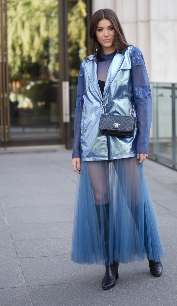 This outfit showcases a blue sheer maxi skirt layered under a metallic blue jacket for a futuristic and trendy vibe. The look is accessorized with a black quilted bag and sleek black boots, giving it a balanced and polished finish. Ideal for those who enjoy fashion-forward spring styles.