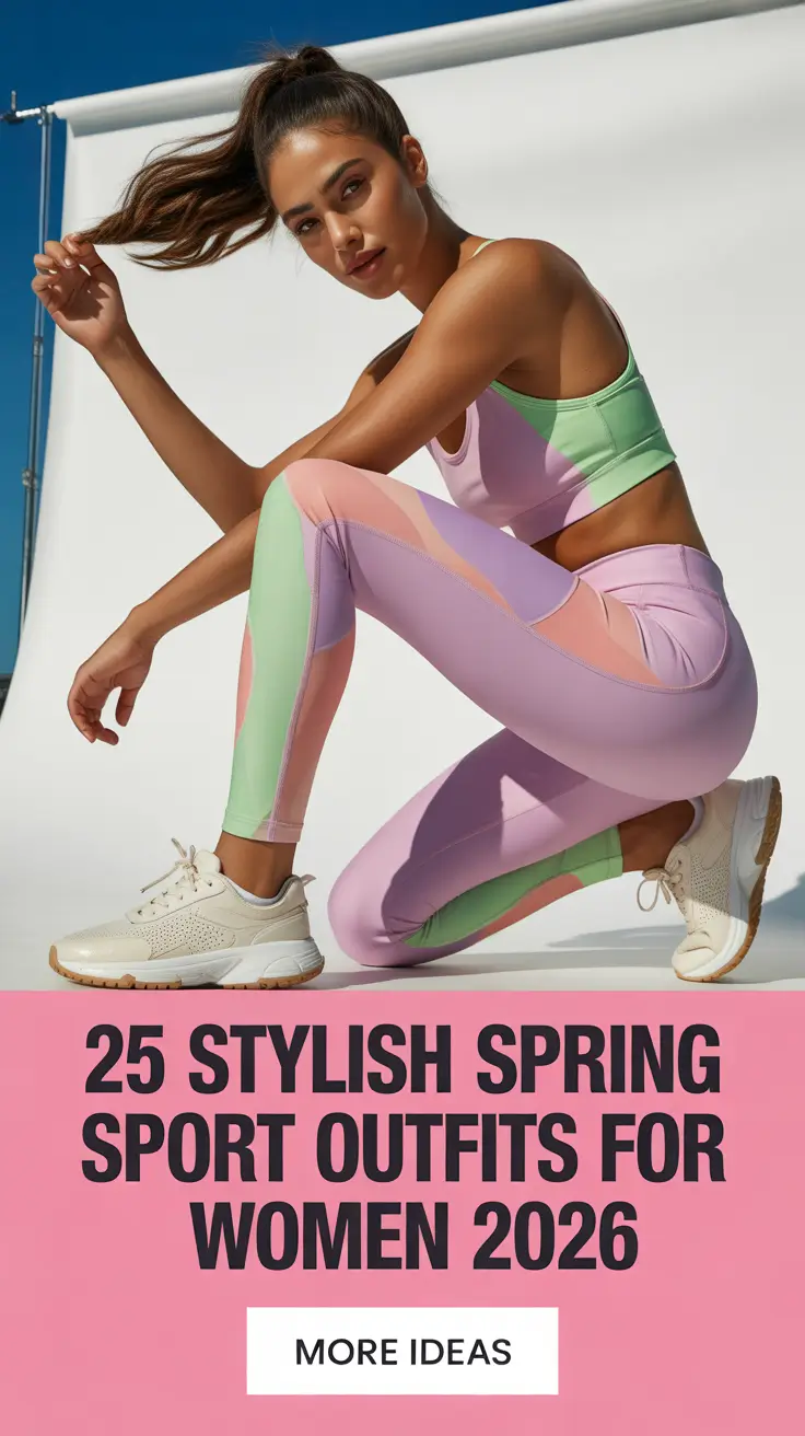 This outfit is basically spring in wearable form – a lime sports bra, a purple-and-green windbreaker, and ombré leggings that fade into soft rainbow tones. It’s playful, upbeat, and still totally Fashion-forward for 2026.