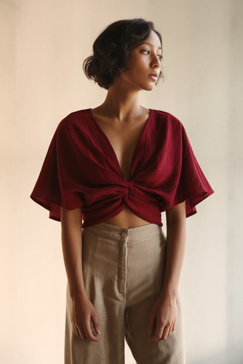 #15 Deep Red Twist-Front Top and Neutral Pants for Understated Boldness