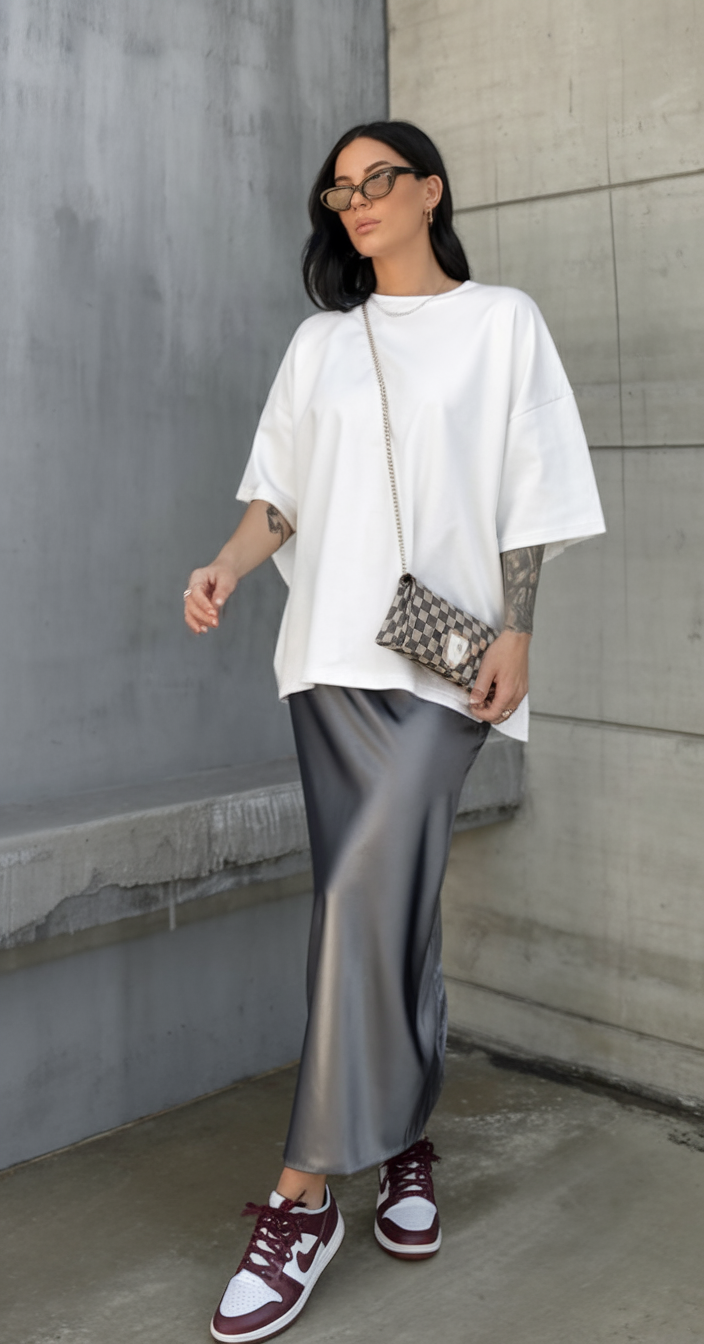 An oversized white t-shirt is perfectly paired with an oversized charcoal satin skirt, creating both casual and elegant outfit options. These textural contrasts make the ensemble the go-to piece for casual styles that work for both urban strolls and/or car trips. The sneakers give the outfit a 40 casual style recognition while maintaining a contemporary freshness. This outfit is an excellent choice for comfort-oriented clothing in 2025.
