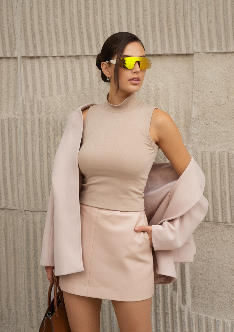 This outfit features a sleeveless high-neck top and matching mini skirt, complemented by an open-front blazer. The simple monochromatic design with polished lines creates a sophisticated look that works well for office and business casual settings. The elegant take on well-dressed and cute fashion presents itself as sophisticated casual wear aimed at contemporary adult women aged thirty and above. The attire works remarkably well for business meetings in Jaipur and then becomes appropriate for rooftop events during the evening.