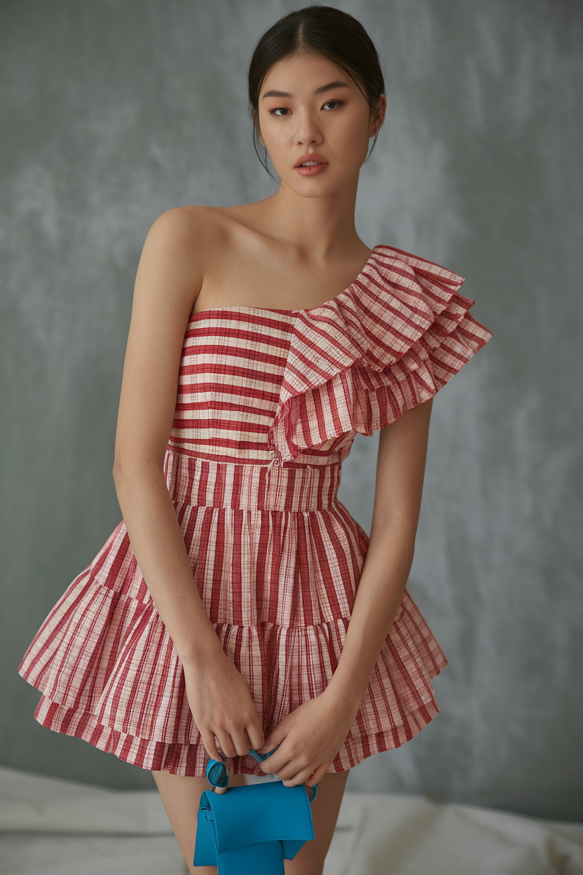 A mini dress in red and cream striped fabric features a one-shoulder neckline with wide ruffles as the main design element. The fitted waist of the dress transforms into a round flared skirt with multiple layers that create movement for the wearer. This dress suits petite women by integrating into fashionable yet classy cute dresses with its vibrant design. People will admire this dress during Rishikesh’s sunny days and modest birthday events.