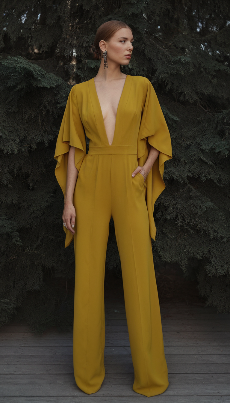 Mustard deep v-neck jumpsuit features cape sleeves that flow into a clean waist shape for a bold dressing effect. The jumpsuit blends sharp styles with smooth fabrics through its strong construction lines. Women in their thirties can also use this garment for stylish events in the summer of 2025. A power piece for those who lean toward classic, simple dressing.