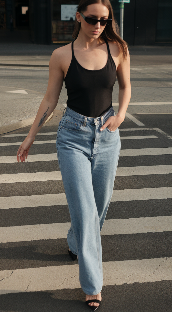 The outfit consists of a fitted black tank top with thin straps paired with light blue jeans with a high waist and a relaxed, roomy silhouette. The stiff top meets the dangling denim in a way that creates contemporary proportions. Travelwear and casual my style aesthetics will find this outfit to be an excellent foundation piece because of its easy accessorizing potential. Any woman who wants to create classic 2025 summer outfits must consider this effortless essential after turning thirty.
