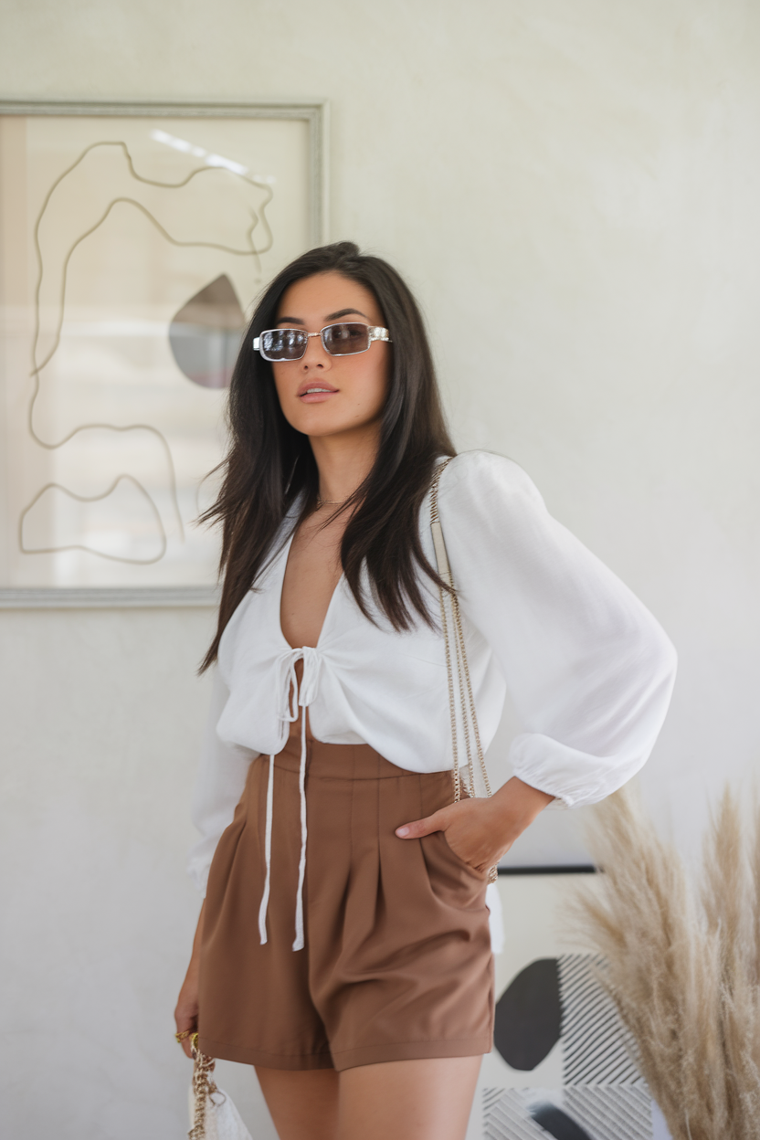 #7 White Tie-Front Blouse and Brown High-Waisted Shorts