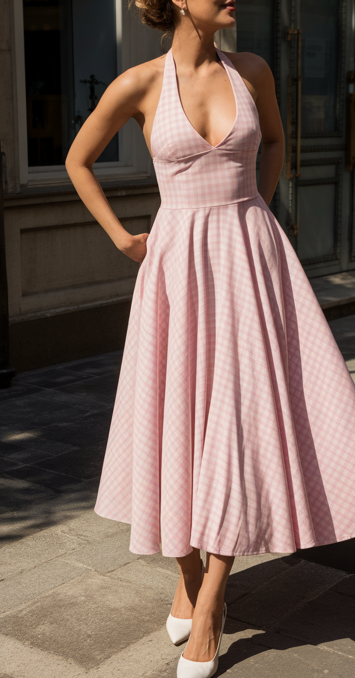 A light pink gingham dress features a halter neckline with a fitted torso that flows into a voluminous full skirt with an effortlessly structured silhouette. Together, the pattern and silhouette create a retro-modern look. This classic piece belongs in the fashion realm of understated birthday wear as well as elegant holiday attire. Women over 30 will find this option ideal for their selection of ageless romantic outfits for the upcoming Summer 2025 season.
