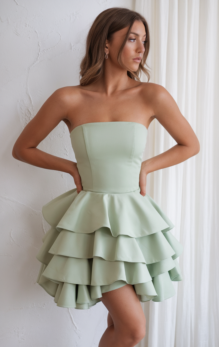 The soft mint green mini dress is fitted at the top before expanding into multiple elegant ruffles at the bottom. The outfit combines a strapless cut with layers of fabric that create feminine volume. This outfit perfectly blends the elegant features of cute dresses with teasing characteristics, making it perfect for birthdays and summer social events. Adult women beyond their thirties can successfully choose such clothing trends for 2025.