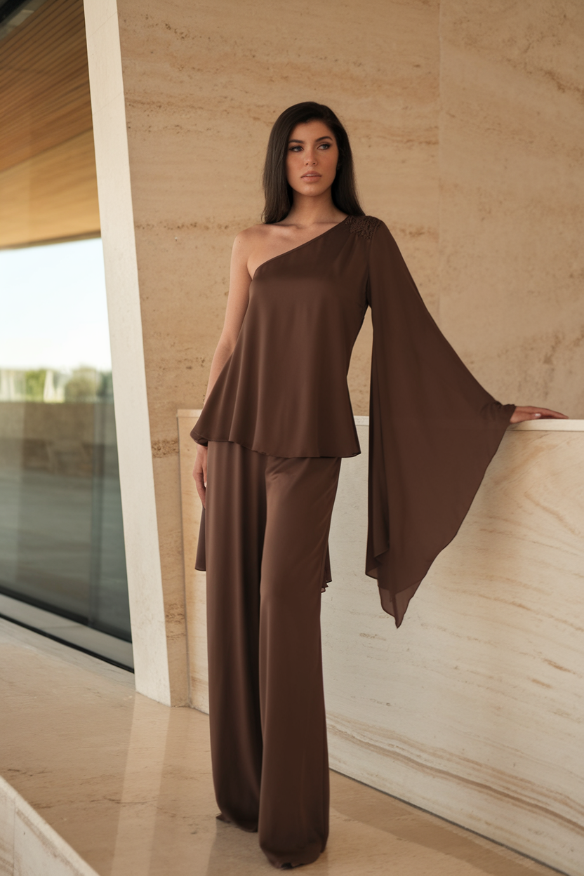 #21 Chocolate One-Shoulder Set with Flowing Sleeve for Evening Drama