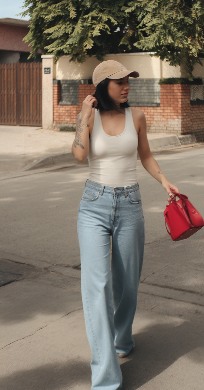 A streetwear base is created by combining an off-white tank top with distressed light-wash jeans cut in a high-rise, wide-leg style. The casual style of the jeans references 40s casual fashion trends, but the fitted top adds structure to the ensemble. This smart casual ensemble represents my personal style choice for warm weather and works well as a stress-free tourist outfit suitable for casual travel. Women over the age of 30 should consider this dress as their versatile western option for comfort and confidence.