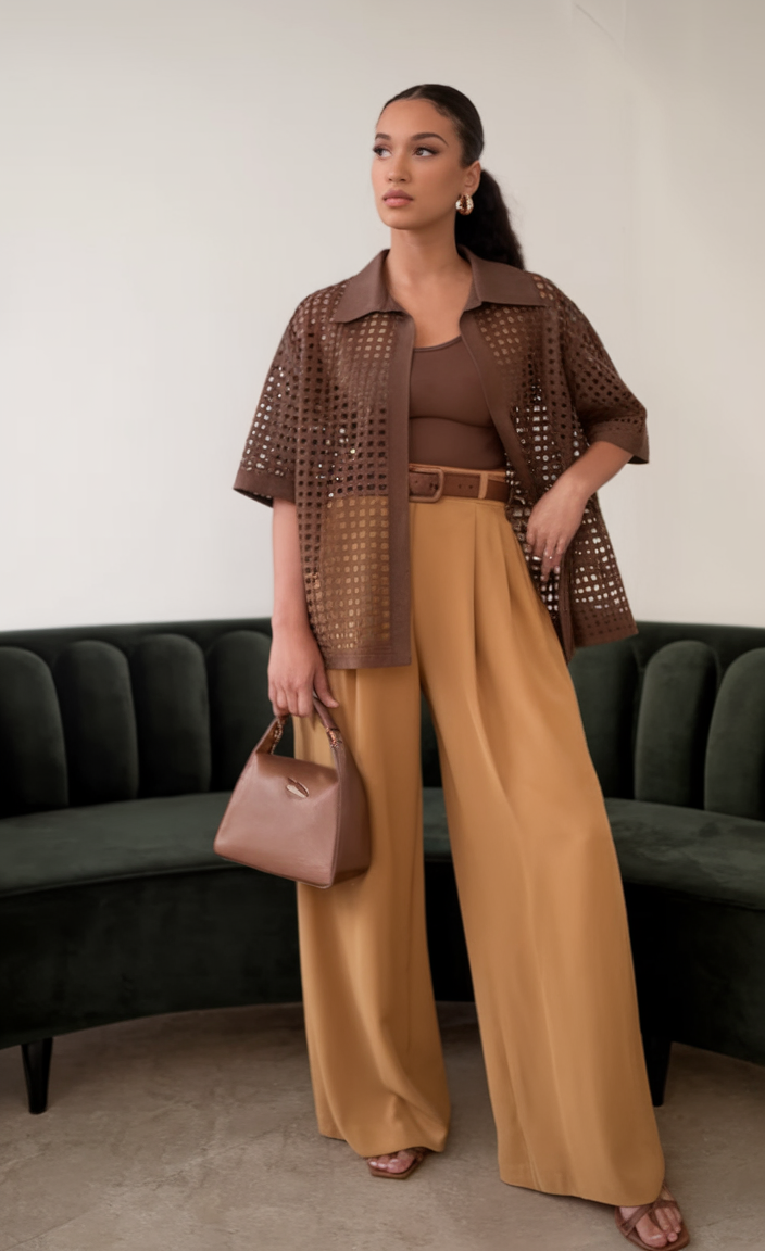 A trendy outfit brings together mustard trousers with wide legs and chocolate brown belt and matching mesh-effect laser-cut shirt. The vertical layering effect on top of a fitted base offers visual depth yet enables comfort and casualness that works well with summer office climate. The blending products create contemporary vibes with monochrome style elements. A strong option for business casual environments with a creative or industrial lean.