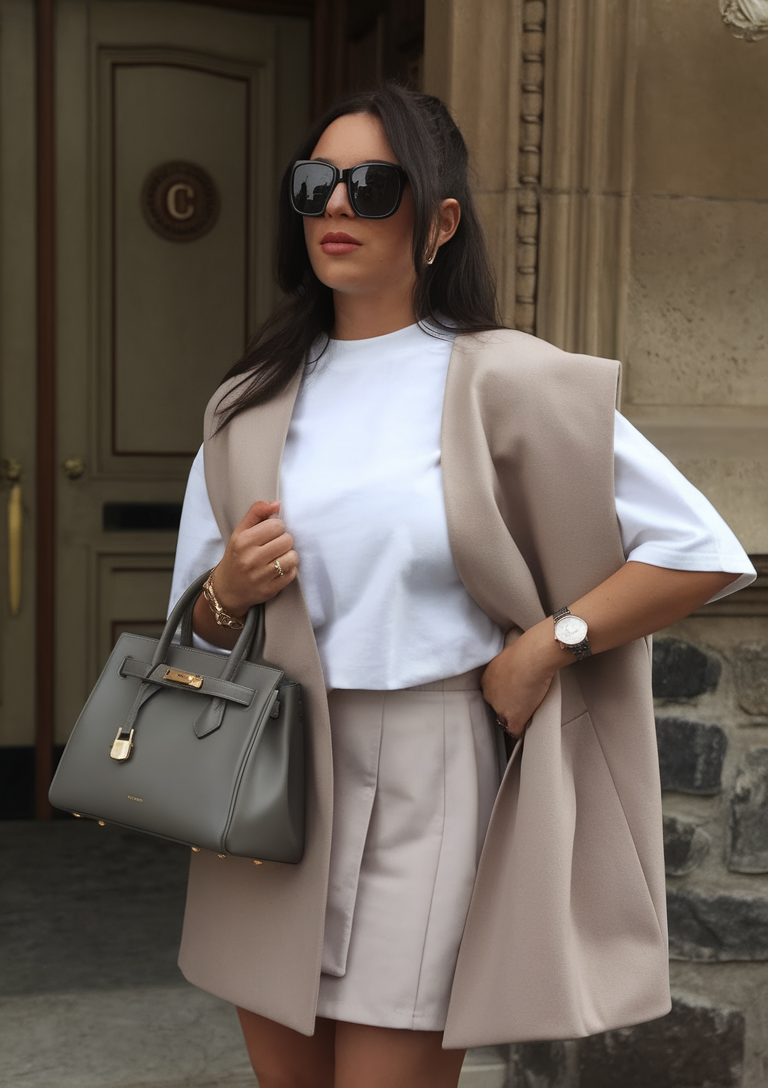 The ensemble includes a sleeveless beige coat that layers with a white t-shirt and moves on to a high-waisted pleated mini skirt in the matching light hue. The outfit balances a youthful style with relaxed designs suitable for the contemporary professional settings which require an informal dress code. The combination of black and white in this outfit creates a refined professional atmosphere that suits women who are both 20-somethings and wear size 40. The ensemble suits modern business dresses which require a neat appearance over formal business requirements.