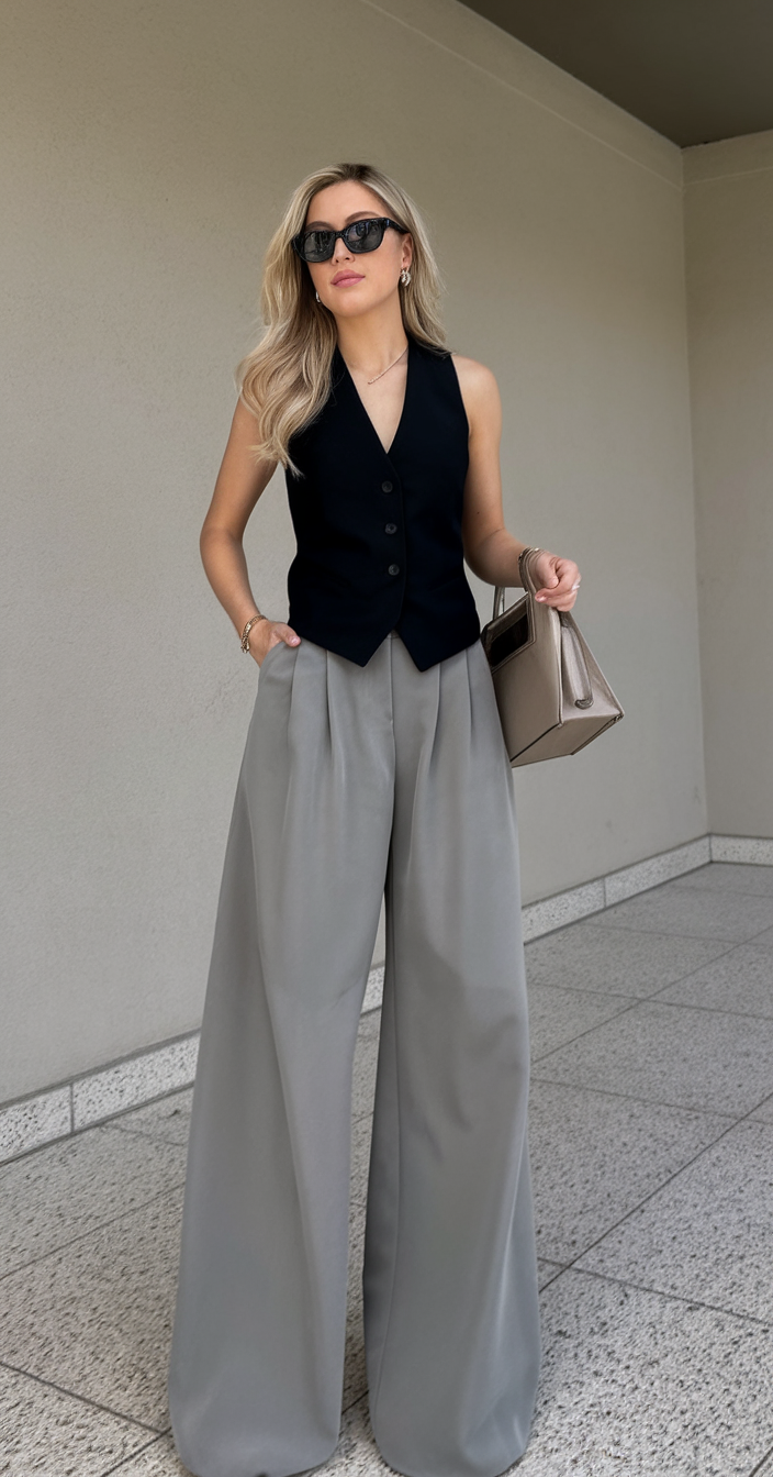 Black sleeveless vest takes center stage to form a masculine ensemble that pairs with wide-legged gray high-waisted trousers. The minimalist design of this cut attracts professionals because it functions excellently in business settings and when meeting clients. The exaggerated pants create a strong contemporary vibe which harmonizes with the structured minimalistic style of the upper top. This ensemble suits women who want to buy office apparel that creates a long-lasting powerful office look.