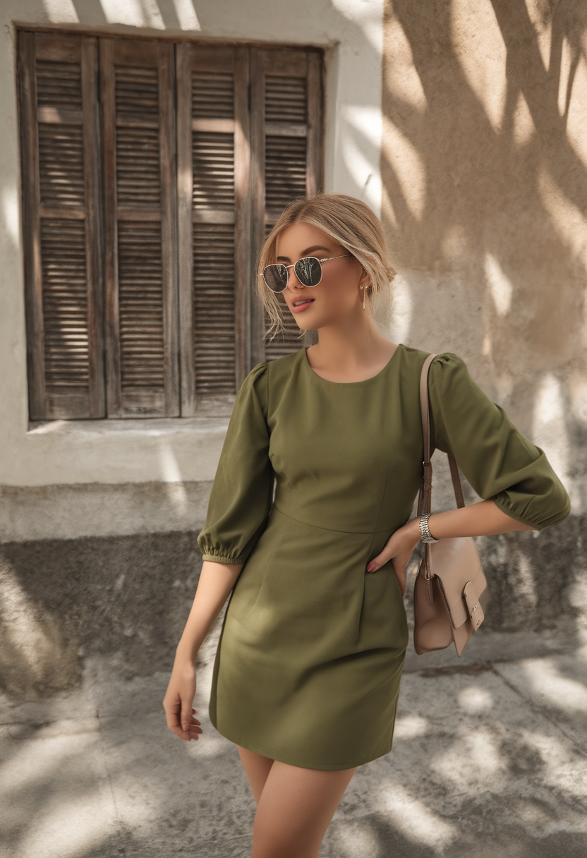 The olive green mini dress fits perfectly while its puffed sleeves at the three-quarter length combine with front pleats to define the waist area. The professional style of this garment comes from its structured design but its length adds modern and female appeal. Ideal for warm summer days in business casual environments. Its solid hue works well with various accessories to create a stylish refined appearance.