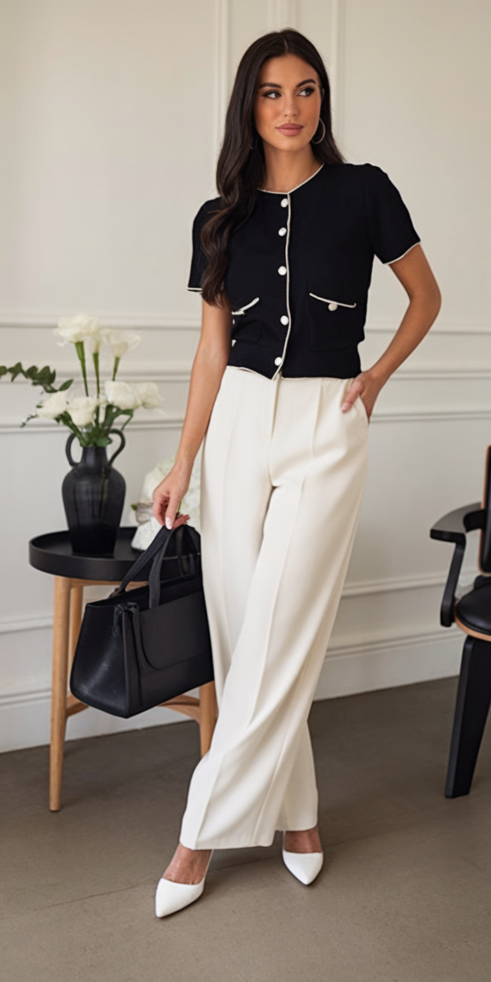 This smart casual outfit consists of a short-sleeved contras-trimmed blouse connected with high-waisted wide-leg white trousers. The professional and modern workplace benefits from this outfit because the crisp color contrast highlights the silhouette while delivering a contemporary business mindset. Women between ages 20 as well as individuals desiring modern yet ageless trendy garments should choose this outfit. The outfit complements various figure types particularly individuals who wear clothing between sizes 40 and upward.