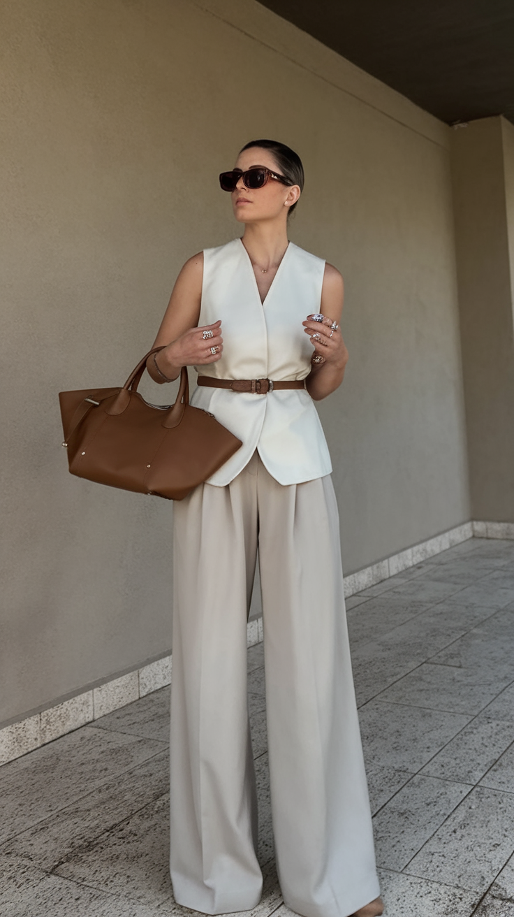 The ensemble combines an off-white sleeveless blazer with structured fit alongside fluid high-waisted trousers in pale beige color. The white tank serves as an underlayer under the blazer to create a contemporary appearance that works perfect for business settings requiring elegant dressing. Wearing the pearl necklace with this outfit brings sophisticated charm to your smart casual ensemble. The outfit demonstrates the 2025 tailoring concept by showcasing both dominant and gentle styles.