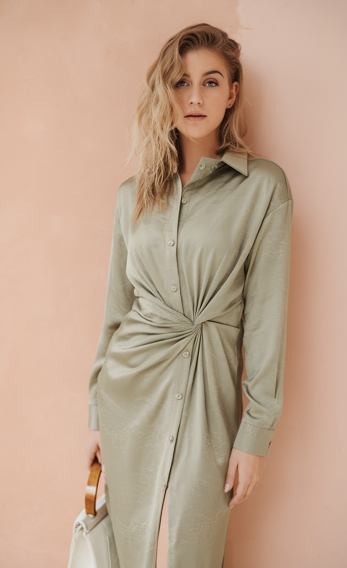 A long-sleeved shirt dress uses sage green fabric which envelops the body with buttons down the front and has a waist-twisted asymmetrical design. Light-reflective satin fabric gives an elegant luxurious touch due to its sophisticated tailored design style which maintains a refined smart casual appearance. The center body-flattering draping on this design brings mobility to the outfit which works perfectly as a 2025 office professional wardrobe selection. This clothing piece offers Japanese-inspired minimalism combined with a delicate style enhancement.