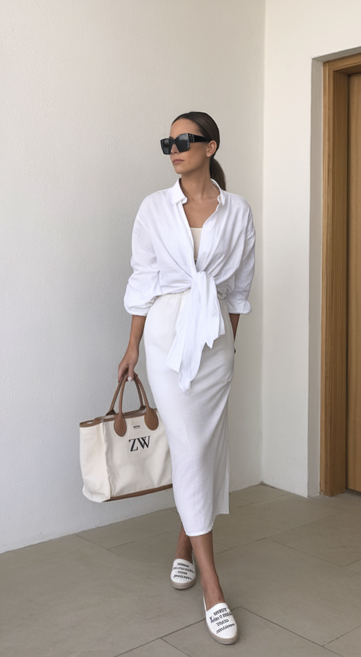 Such a monochromatic summer ensemble incorporates a classic white button-up shirt incorporating front ties and draping over straight-cut midi skirt fabric. The clothing item presents relaxed comfort through its breathable cotton fabric while providing an elevated leisure feel for hot summer days. The silhouetted attire maintains a contemporary shape which suits both professional venues as well as places of business. The outfit works as a straightforward method to achieve professional yet casual appearances without extra work.