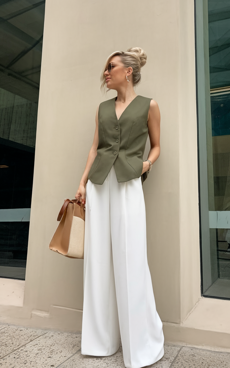 A structured olive vest pairs with pointy hemlines to create a smooth smart casual outfit when worn with flowy white trousers that sit high on the waist. This combination presents a minimalistic presentation which demonstrates contemporary workplace fashion for hot seasons. This outfit combines versatility with office and outdoor nammeeting capability due to its cooling fabrics which appeal to summer-active women. The combination between these soft contrasting colors suits well individuals who wear sizes 40 and above.