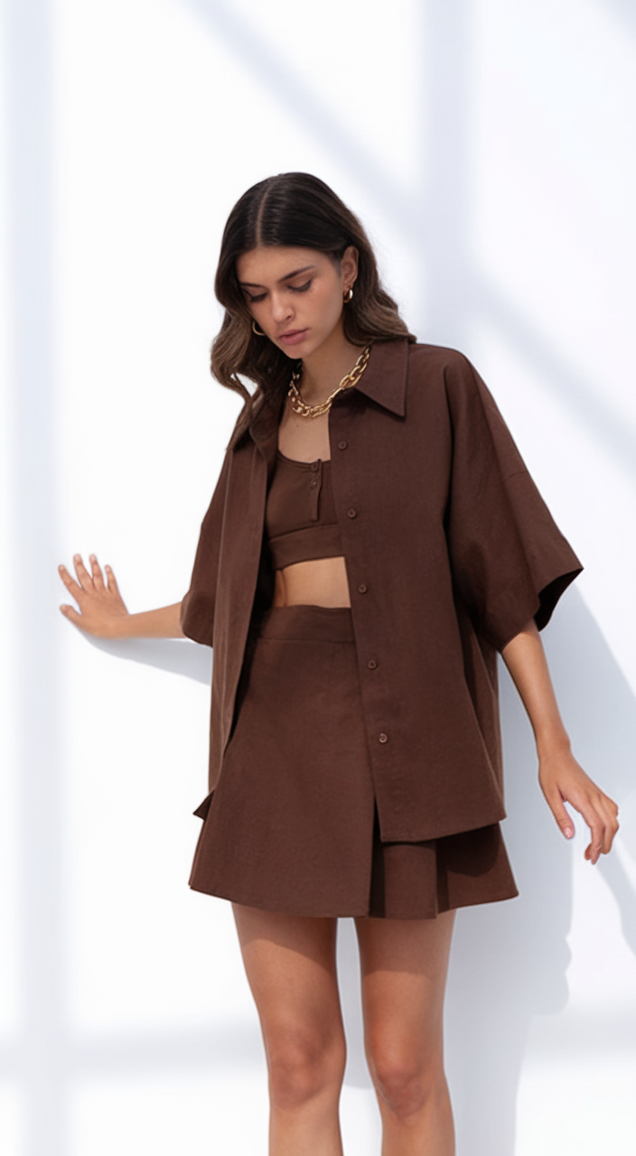 The brown linen ensemble features a comfortable fit between an oversized shirt with short sleeves and cropped top that matches the tailored mini skirt. The shirt maintains its relaxed shape to counterbalance the fitted underlayers and skirt while providing a fashionable look suitable for creative and outdoor workplaces in the 20s era. This linen ensemble serves as a summertime business option that works for workplace environments beyond basic forms of dress code. The outfit maintains a harmonious look from one item to another because all the elements share the same color profile.