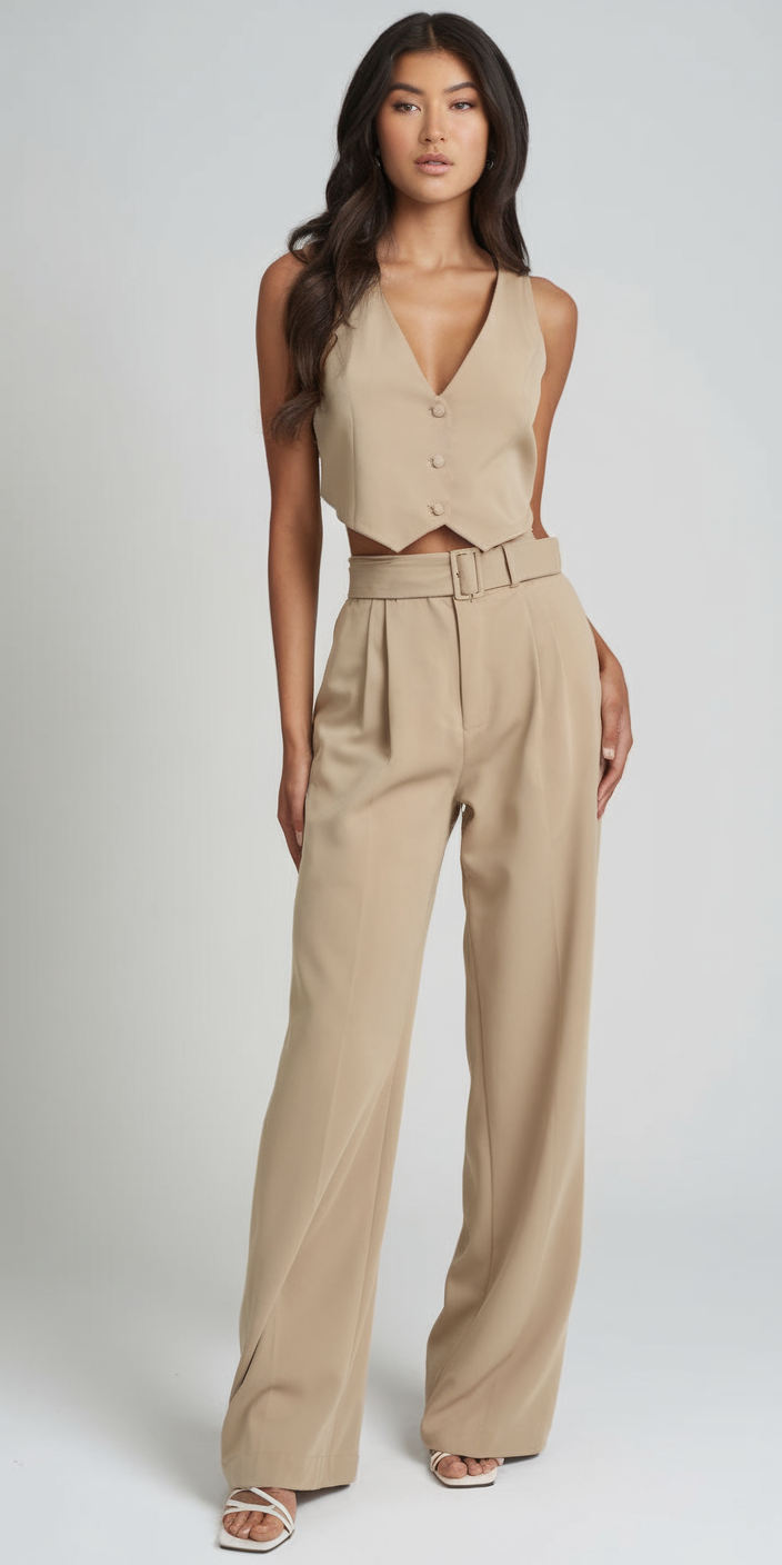 A buttoned-up cropped vest meets belted high-waisted trousers of identical beige shade. The set serves strictly business casual style while maintaining an elegant look appropriate for office work or formal networking settings. The outfit consists of fitted waist and structured pants which accommodate sizes up to 40 and represents stylish fashion for the year 2025. This outfit meets the needs of young women during their 20s who want to acquire fundamental wardrobe essentials.