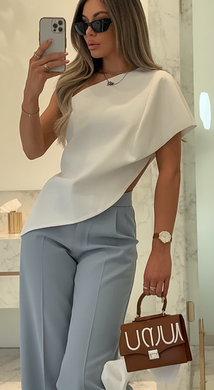 The modern, sophisticated, business casual women’s outfit is comprised of a tailoring blue dress pants and a contemporary ensemble, composed of a shapely blue pants with an asymmetrical white blouse cut on a severe angle to give it a dramatic design sophisticated spine. This outfit will take the lead in summertime business casual attire of the 2025 summer. This look is complete for young professionals after work events or conferences when carried along with brown structured handbag.