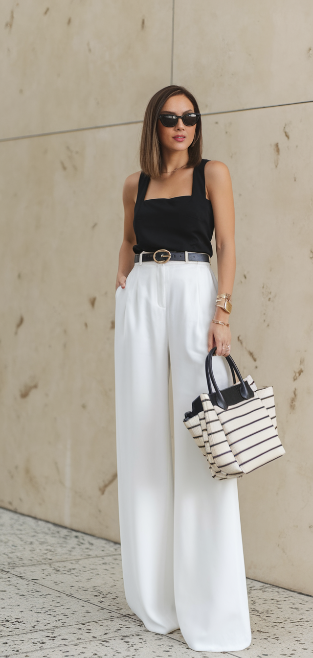 #13 Fitted Black Tank Top with White Wide-Leg Pants