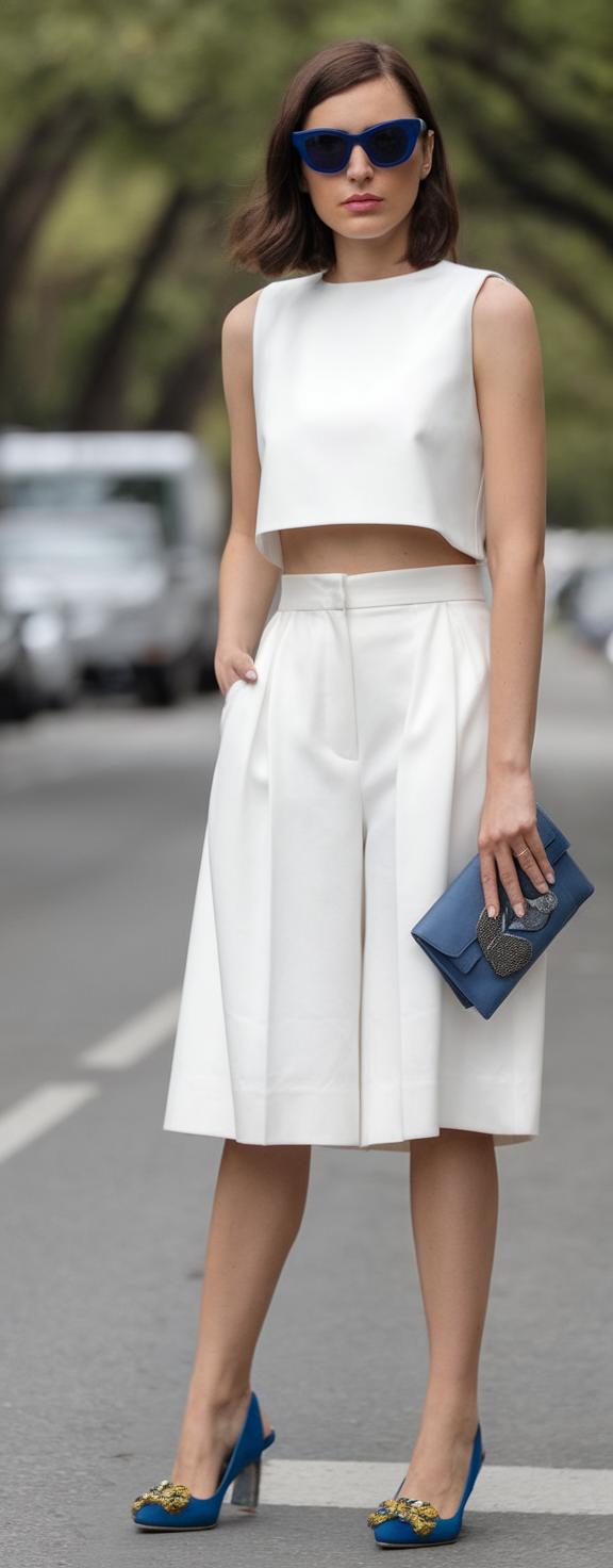 This outfit is elegantly monochromatic with a structured waist high sleeveless white crop top and flowy high waist culottes. The clean lines and structure of the outfit makes it sophisticated yet modern. Paired with stylish blue heels and clutch, this look represents her business casual attire in the summer of 2025.