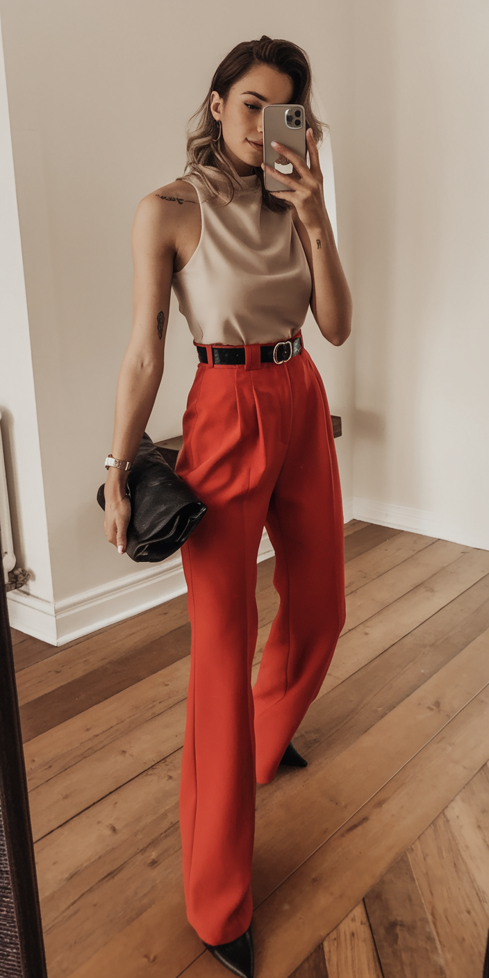 The look features a red sleeveless blouse and black high waisted wide-legged pants with a fabric belt. Young professionals will appreciate the overpowering combination of red and black. This look is perfect for conferences and dressier work meetings when paired with a black structured handbag and nude heels.