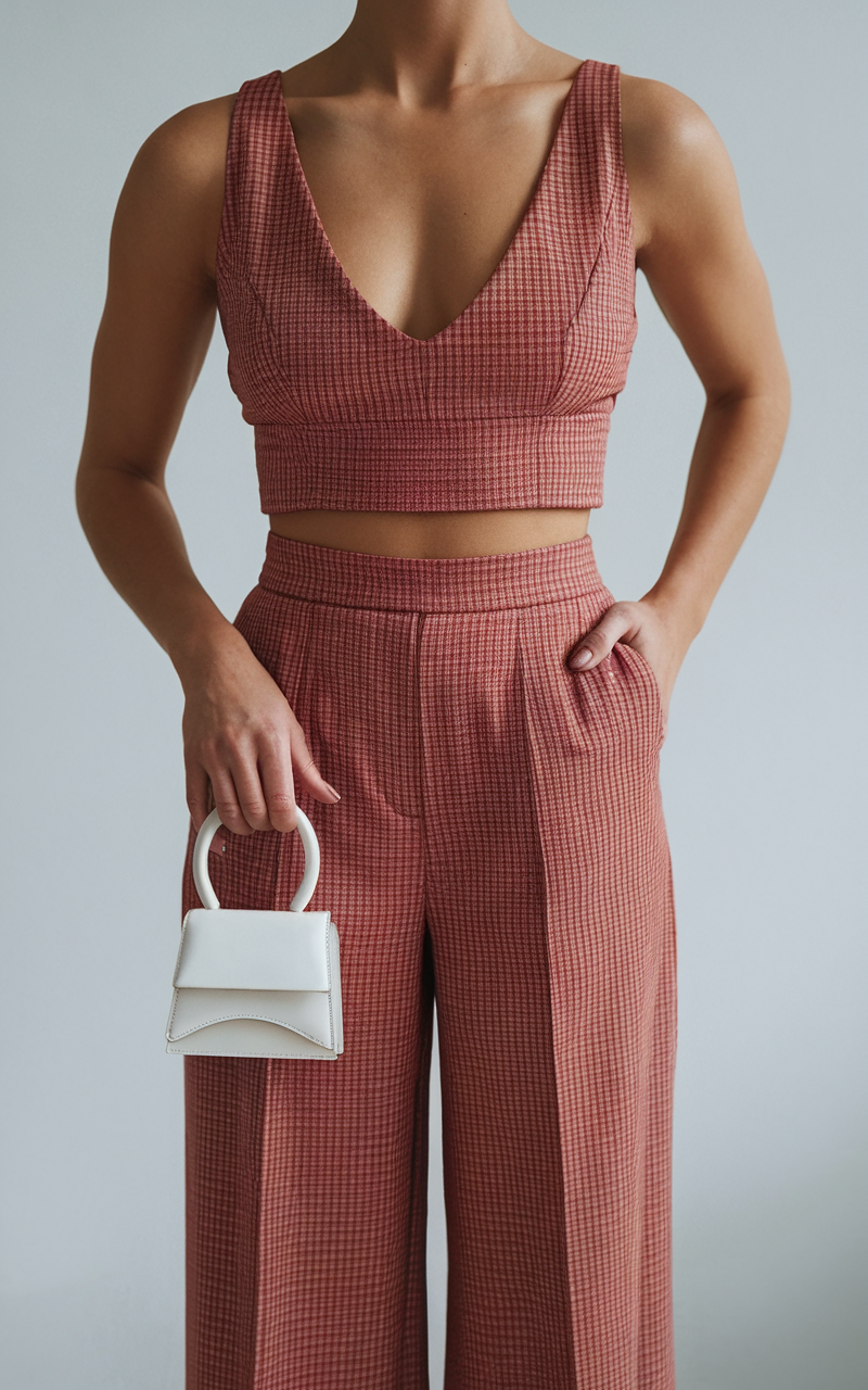 Modern matching sets have now taken the fashion insdustry by storm. These sets come true V neck crop top with and highwaisted wide flowy trousers combined together for a perfect assembled statment. The muted deep red colored fabric of this set adds the perfect energetic youthful look for format office wear during summers sporting a structured white mini handbag further enhances this look.