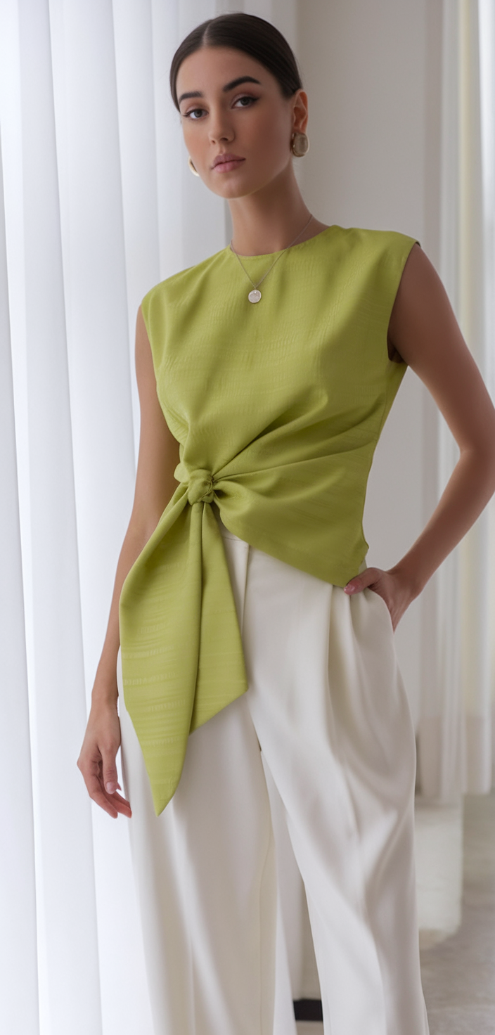 #4 Lime Green Draped Blouse Paired with White Trousers