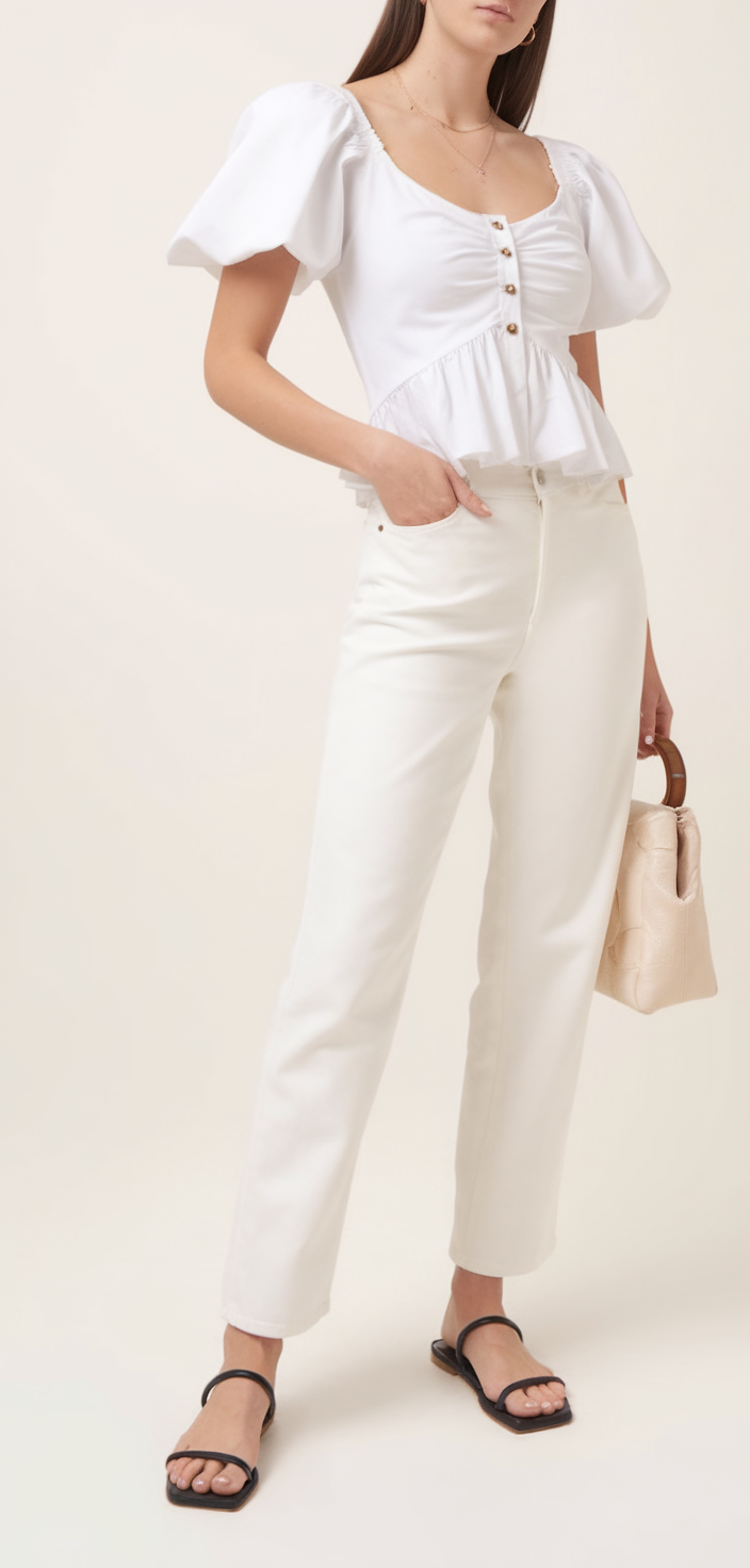 #2 White Puff-Sleeve Peplum Blouse with Straight-Leg Jeans