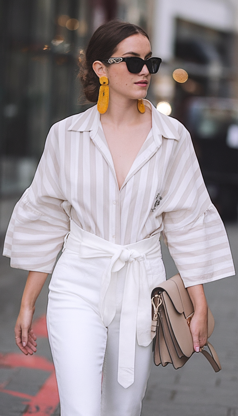This flattering look features sophisticated beige and white striped buttons up blouses, which tie at the waist for added structure. The flowy look of the trousers is complemented by the belt. Completers of this look are the high-waisted white trousers which gives a refined and stylish look for summer office wear. The neutral structured handbag with a touch of statement earrings round out this trendy work look.