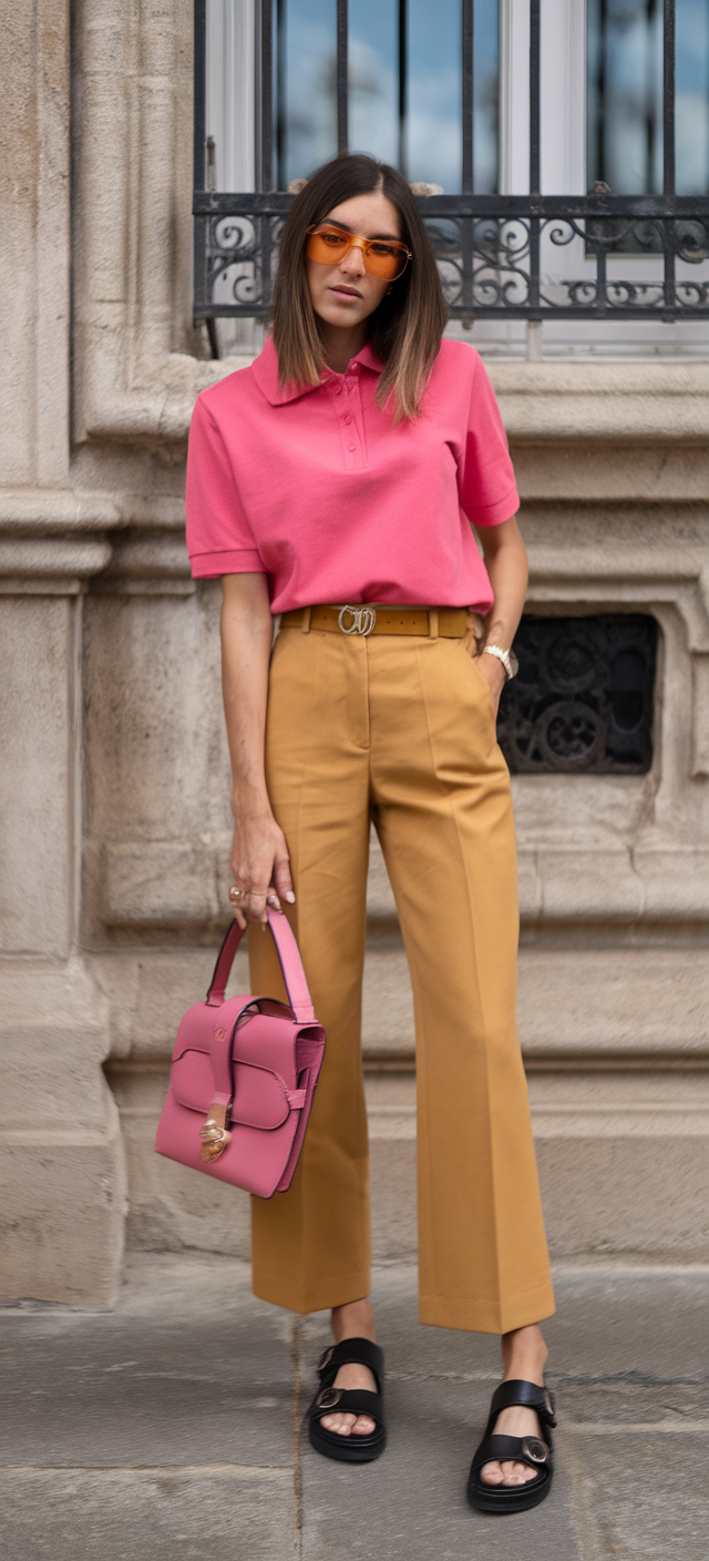 This outfit set marks a daring statement in regard to traditional office wardrobe. It showcases a bright pink polo shirt with a feminine cut, which strikes straight on the tummy area, in combination with elegant high-waisted mustard trousers. Rigor comes also along straight legs of the pants which is further tightens by a slim belt. Complemented by black platform sandals and matching pink handbag provide the outfit with a sophisticated vibe. This look is convenient for semi-formal traveling or suite a young working professional curvy wardrobe.
