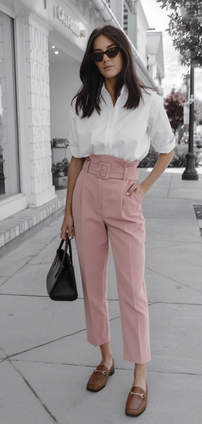A wide belt enhances the waist for a more tailored look, while the pink trouser trousers, stylishly paired with a structured white button-up blouse, complete the office-appropriate outfit. This chic work outfit for the office is better complemented with brown loafers and a structured black handbag, making it ideal for an interview or polished office day.