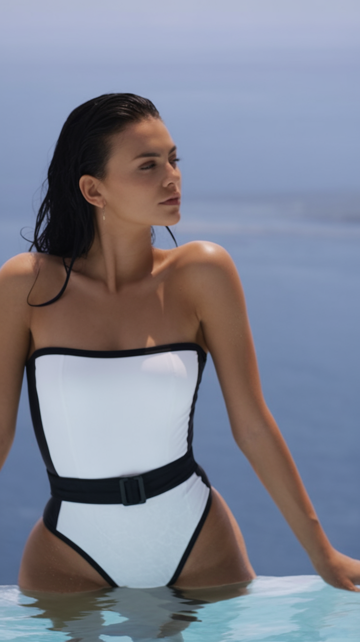 Along with its simple strapless design, this white one-piece swimsuit comes with bold black piping, creating a modern impact. The subtle and sharp structure is enhanced even further by the sleek black belt that cinches the waist. The high-cut leg design is timeless and becomes more appealing as it sophisticated to the overall look. Ideal pick for those who fancy classic aesthetic outfits on vacation.