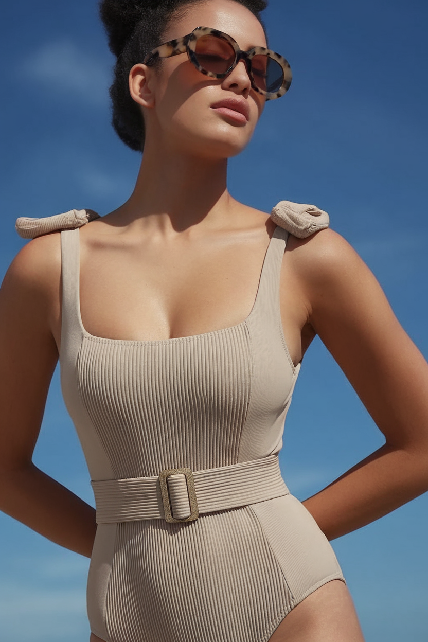The neutral-toned swimsuit is made of ribbed fabric which enhances its overall aesthetic appeal. Its thick shoulder straps offer stylish support to the structured square neckline and are tied at the shoulders. The waist is cinched with a matching belt that has a statement buckle to create a flattering silhouette. It is an ageless choice for vacation outfits that blend comfort with elegance.