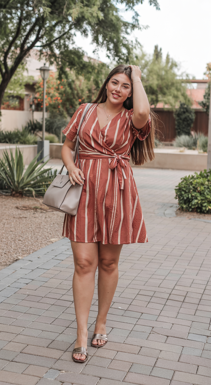 #27 Rust Striped Wrap Dress with Neutral Accessories