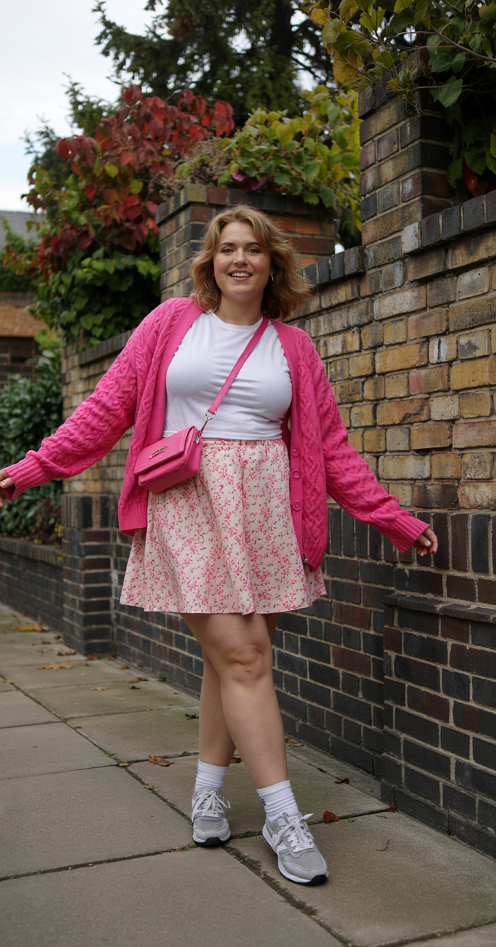 This outfit features a fuchsia cable-knit cardigan layered over a plain white fitted tee. A linear floral skirt provides sultry softness that pairs beautifully with sporty sneakers and a crossbody bag that repeats the same color scheme. This outfit creates a fantastically relaxed look suitable for walking around York or other urban areas during the late summer season. The outfit stands as a delightful addition to the Summer 2025 outfits for women according to your list.