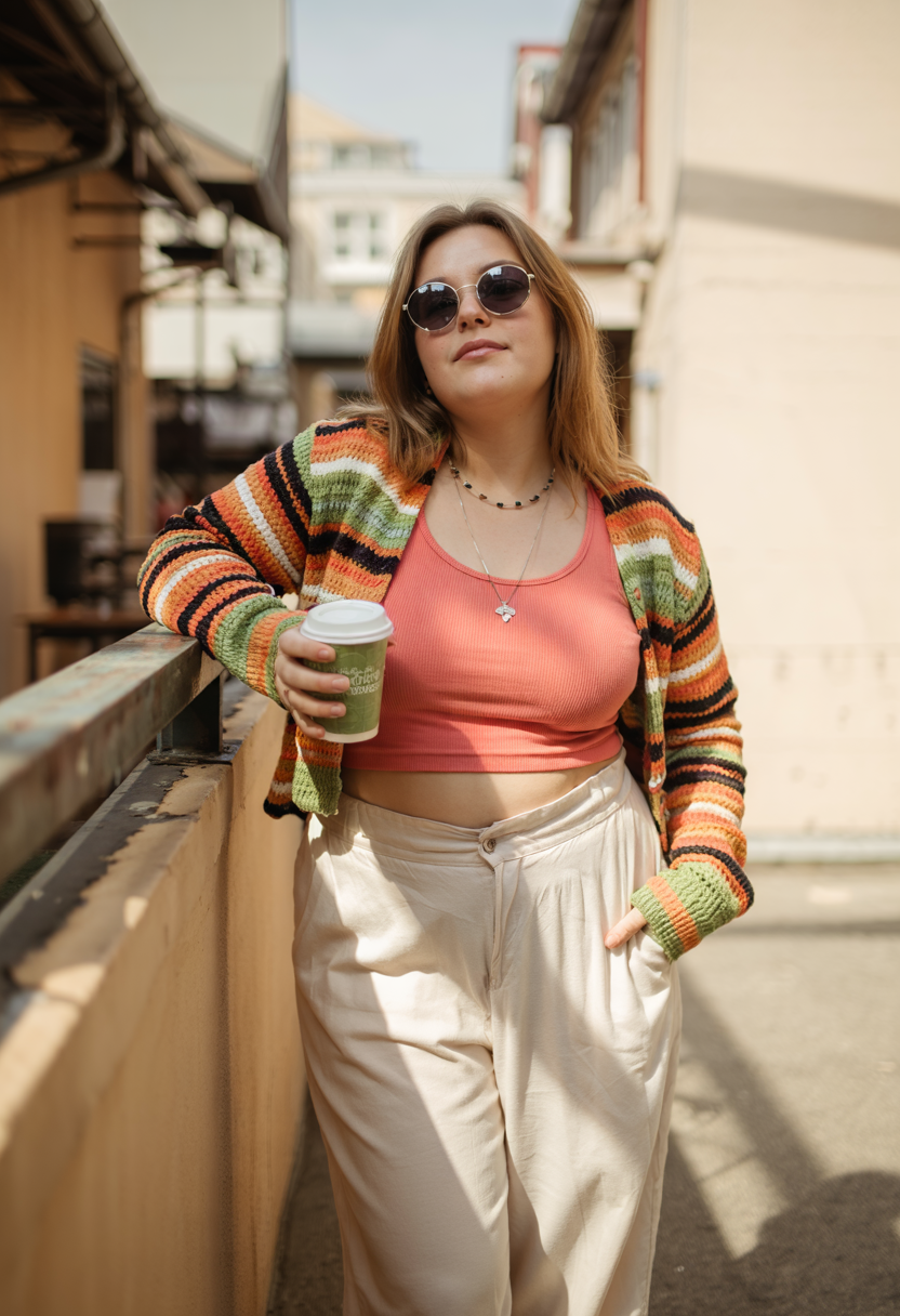 The retro-inspired colorful striped crochet cardigan adds vintage style to this relaxed casual outfit. The ribbed coral crop top adds a relaxed touch underneath the outfit. The wide-legged cream-colored pants are lightweight and perfect for hot weather. The outfit design successfully blends comfort and beauty to create a summery, elegant look.
