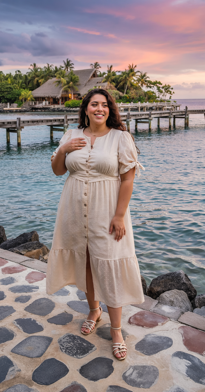 A cream-colored midi dress features a polka dot design with soft sleeves with tie detailing. The button closure adds shape, while the flowing hem adds breathability and comfort to the design. The outfit serves as an ideal look for beach or resort visits within the profile of Summer 2025 plus size outfit ideas for women. The modest design and eternal appeal of the simple cuts allow women to wear this outfit on any warm night.